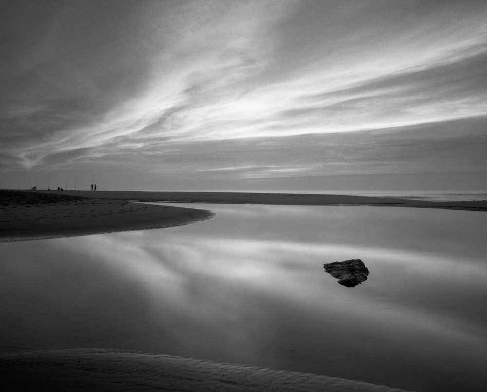 I shoot, mainly, Landscape, Studio Portrait, Nude and Urban Photography. Each one of these kinds of photography have a different approach. I will describe a Landscape session, which is the most complex. First, I decide where I'm going to do the session. Let's assume I will be shooting by the sea, (I live 4 kilometres from the sea, which is pretty simple. First of all, I look at the tide schedule to be aware of the best day to shoot. I like wide tides and usually, I prefer the very low tide, about 15 minutes before sunrise, during autumn, winter or spring, because there is no people on the beach and if the high tide has been very high, the most part of the sand will not have any footprints. For those sessions, I always carry a lightweight but warm jacket, fisherman gloves, fisherman waterproof boots, a warm hat, sunglasses, cleaning tissues for the lenses and filters, red, orange, green, yellow, polarizer filters, tripod, spotmeter, my little black book, where I have several reciprocity failure charts of the films I use, as well as some of my own charts that I make when I start to use film. Tripod is a must, as well as shutter cable release and a few other stuff (a lot of it). When I arrive at the spot, I start to look for the best angle and I start to “imagine” the final image.  Regarding the contrast I want, I choose the filters I will need to achieve the image. Next, I measure light with the spotmeter and see what's the best aperture/shutter speed for the image I want, regarding the depth of field, water movement, contrast, etc. Sometimes, I shoot in a way that is the best compromise, knowing that I will need to compensate some highlights in the film developing or in the enlarger (dodge, burn, etc) or even both, this happens often, because I like to shoot in low light conditions.