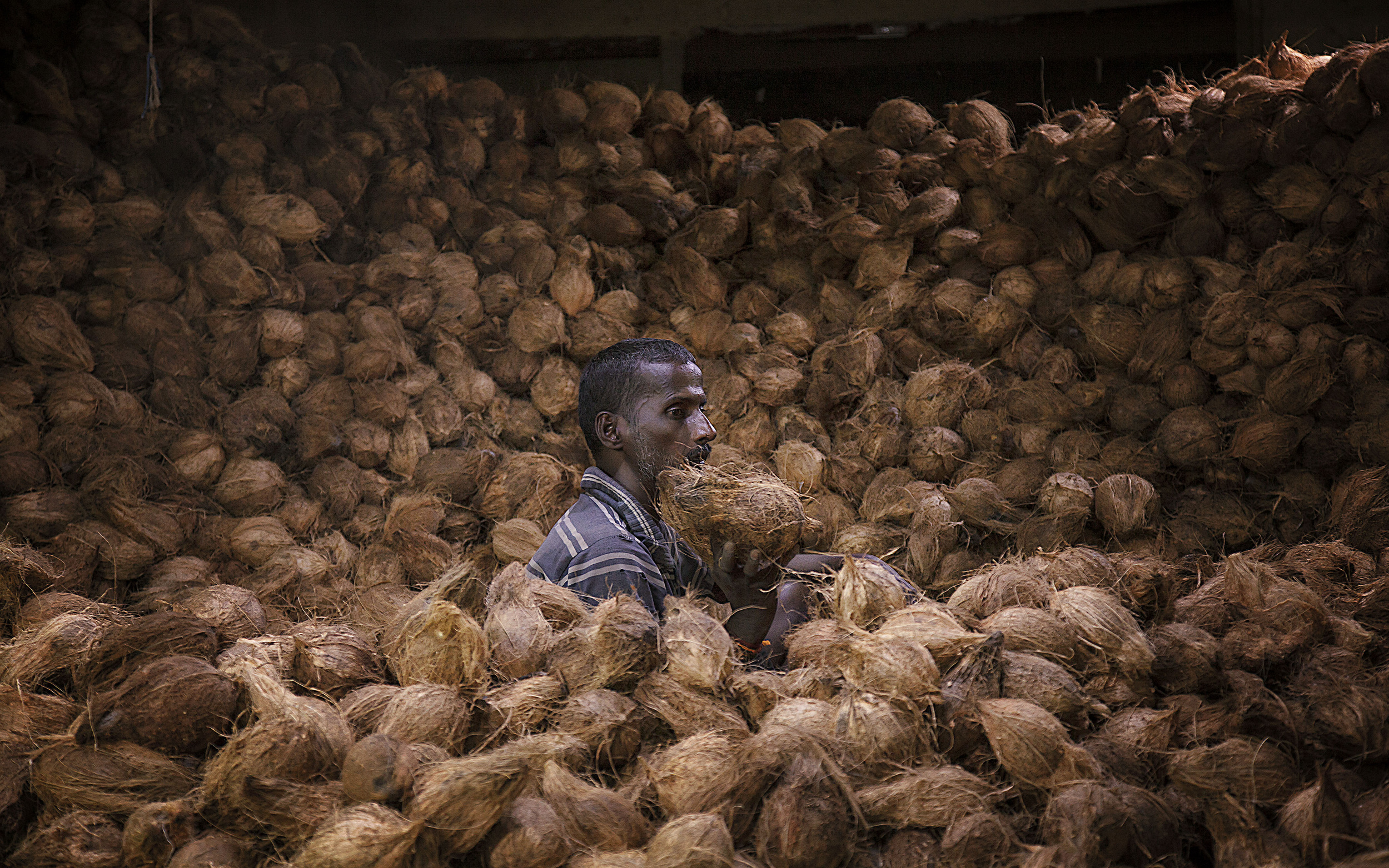 'Garlanded ' was taken in Chennai flower market. I love shooting in markets. This man was dwarfed by these enormous garlands, partly hidden, it was so amazing. It was a candid shot. I didn't speak to him. I was just moving through the market taking pictures wherever there was a good scene or light. Actually it was not one of the first pictures I edited.. I was not sure about the quality. I used a Canon 5D Mark III and an excellent 24 - 105 lens (so versatile).