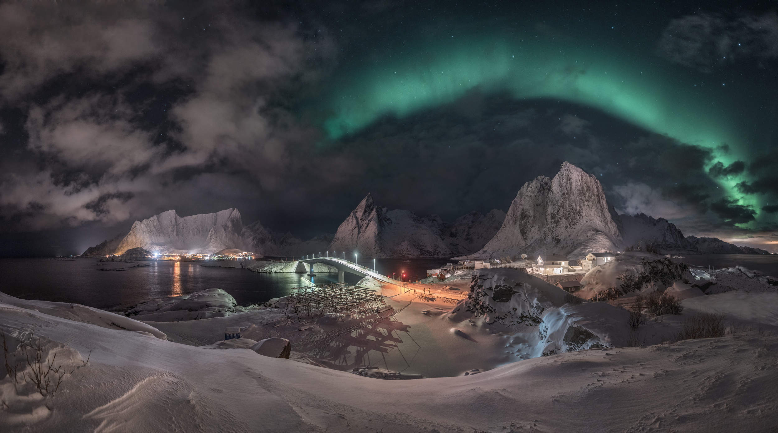 The resulting photo was merged and processed in Lightrroom and Photoshop with the typical adjustments of brightness, contrast, saturation, some adjustments in curves and treating some areas separately. Enjoying those conditions and that specific night were the reasons of 99% of the result.